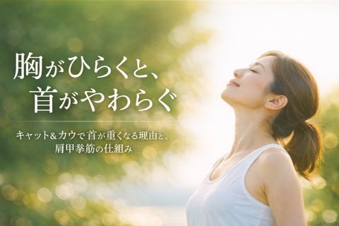 ヨガのポーズの「キャット&カウ」のあと、首の後ろから肩の間にかけての“縦のくぼみ”が重くなることがありませんか?寝違えのようなズーンとした感覚が出る場所です。 ... -