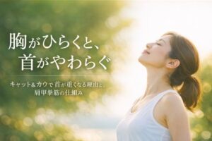 反らすのではなく、胸の奥に空気が入るように広げると、